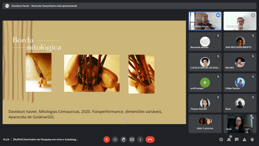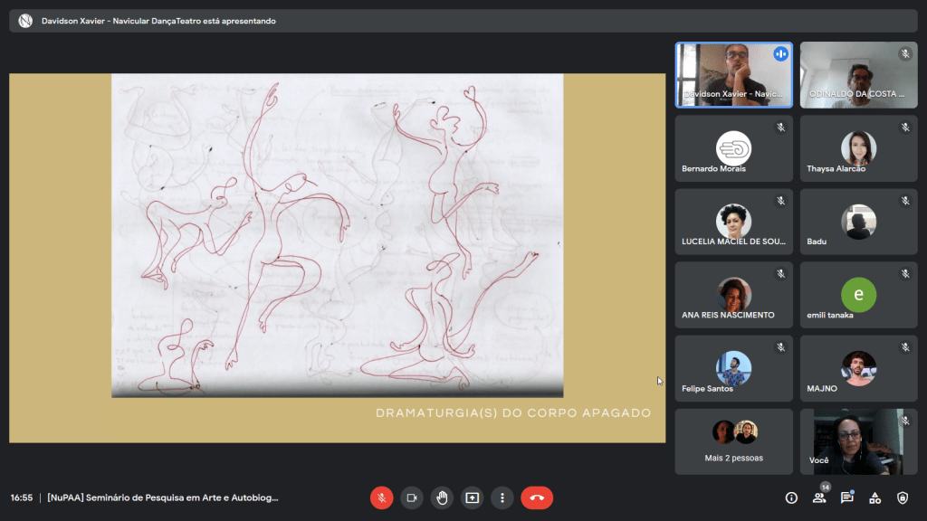 No 17° Seminário de Pesquisa em Arte e Autobiografia do NuPAA, que aconteceu no dia 2 de agosto de 2021, o professor, artista e mestrando Davidson Xavier apresentou processos e resultados de sua pesquisa artística Bordas Indizíveis – Dramaturgia(s) do corpo apagado, em que investiga o espaço auto-ficcional que vai sendo criado no entrecruzamento do teatro com a dança, onde um corpo redemoinho tensiona bordas mitológicas, em movimento espiral, transbordante.