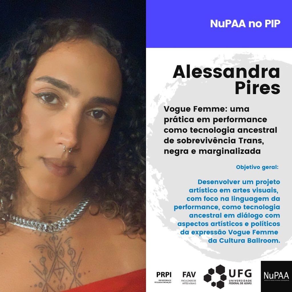 O NuPAA dá as boas-vindas à estudante do curso Artes Visuais Bacharelado da FAV/UFG, Alessandra Pires dos Santos Silva, que inicia hoje seu percurso como artista pesquisadora no Programa de Iniciação à Pesquisa – PIP/UFG, bolsista PIBIC-UFG, uma das 1530 pessoas que integram o programa 2023/2024.