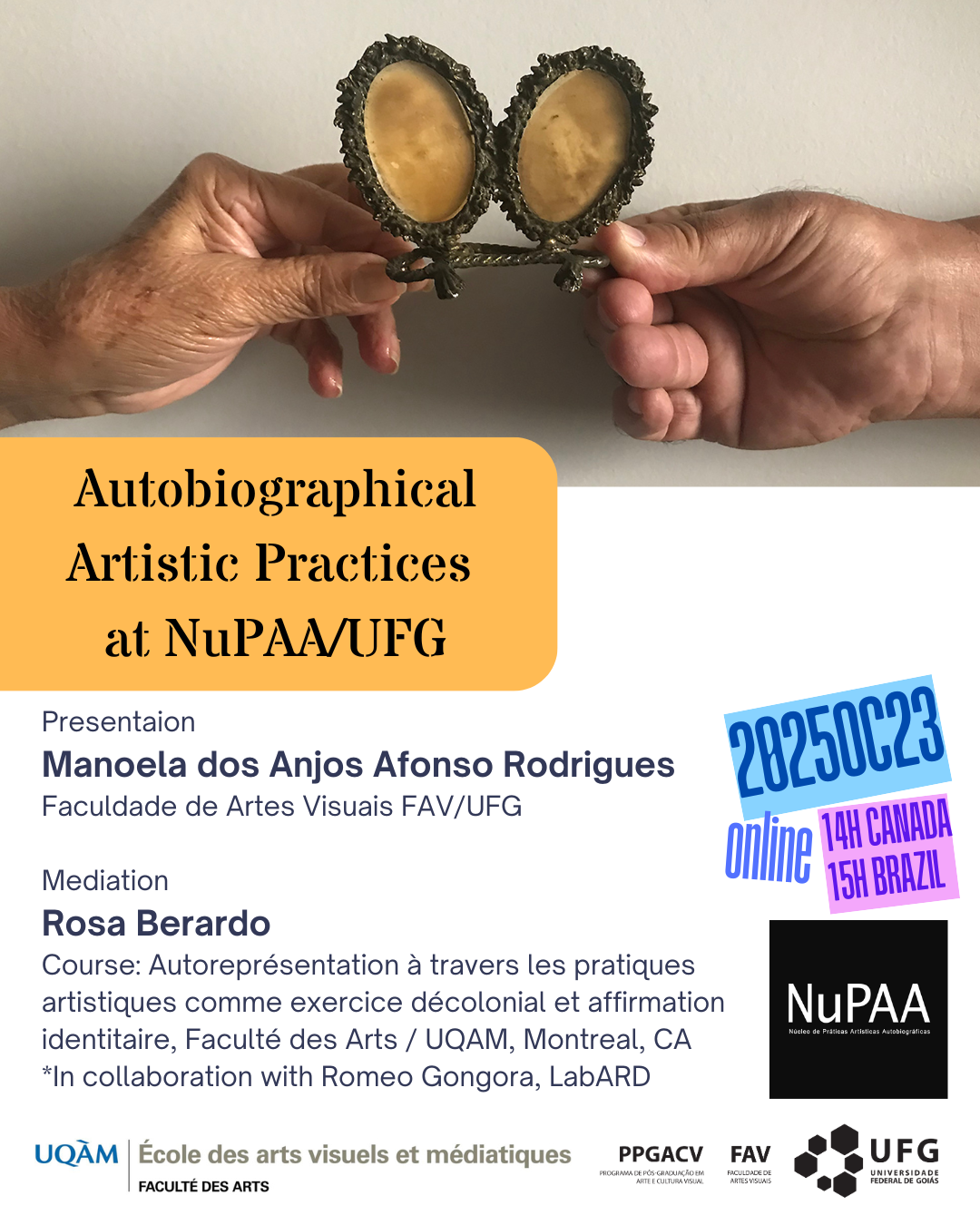 Today, Professor Manoela dos Anjos Afonso Rodrigues has been invited to share her research on Autobiographical Artistic Practices, developed within the Autobiographical Artistic Practices Research Group (NuPAA/UFG/CNPq) since 2017.