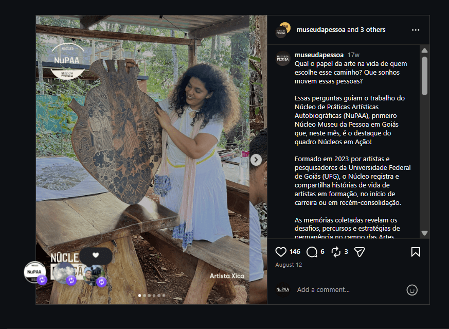 O ano chega ao fim e, conforme vamos atendendo às demandas relativas ao relatório parcial do projeto Contar o Fazer (título público), celebramos cada ação realizada pelo Núcleo NuPAA em 2025. Agradecemos à FAPEG/GO que, através do edital 13/2024, financia as ações deste projeto que tem como objetivo geral “investigar narrativas de vida de artistas em formação e início de consolidação da carreira, atuantes no Estado de Goiás, com foco nos percursos formativo e artístico, e nas estratégias adotadas para inserção profissional na área de Artes. A metodologia envolve as abordagens Pesquisa Autobiográfica em Arte (Rodrigues, 2021) e Tecnologia Social da Memória (Museu da Pessoa, 2009), através das quais busca-se estimular, registrar, analisar, catalogar e disseminar histórias de vida de um grupo diverso de 15 artistas participantes da pesquisa”. Da mesma forma, agradecemos ao Museu da Pessoa pelo reconhecimento de nossas ações, pelo incentivo e pela oportunidade de estarmos juntos em São Paulo, em novembro, ponto alto de nossas atividades, que nos encheu de energia para continuar nosso trabalho em 2026. Muito obrigada também às parceiras e parceiros que se juntaram a nós para dar concretude poética, artística e científica à investigação das histórias de vida de artistas que aceitaram participar do projeto e contar o fazer com tanta generosidade. Em 2026 teremos muitas novidades! Acompanhem o movimento aqui: https://instagram.com/nucleonupaa